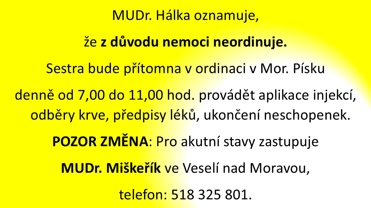 MUDr. Hálka oznamuje, že z důvodu nemoci neordinuje. Sestra bude přítomna v ordinaci v Mor. Písku denně od 7,00 do 11,00 hod. provádět aplikace injekcí, odběry krve, předpisy léků, ukončení neschopenek.